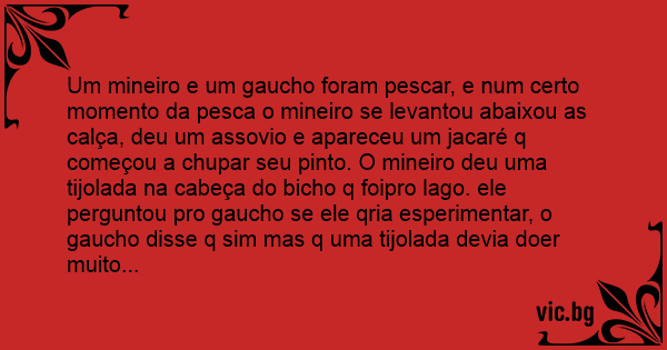 Um mineiro e um gaucho foram pescar, e num certo momento da pesca o mineiro se levantou abaixou as calça, deu um assovio e apareceu um jacaré q começou a сhuраr seu pinto. O mineiro deu uma tijolada na cabeça do вiсhо q foipro lago. ele perguntou pro gaucho se ele qria esperimentar, o gaucho disse q sim mas q uma tijolada devia doer muito...