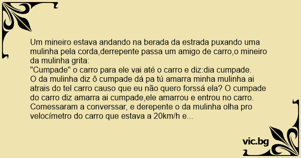 Um mineiro estava andando na berada da estrada puxando uma mulinha pela corda,derrepente passa um amigo de carro,o mineiro da mulinha grita: "Cumpade" o carro para ele vai até o carro e diz:dia cumpade. O da mulinha diz ô cumpade dá pa tú amarra minha mulinha ai atrais do tel carro causo que eu não quero forssá ela? O cumpade do carro diz amarra ai cumpade,ele amarrou e entrou no carro. Comessaram a converssar, e derepente o da mulinha olha pro velocímetro do carro que estava a 20km/h e diz:ô cumpade pode adar minha mulinha é boa,o do carro acelera e os dois conversando de novo ele olha e diz:ô cumpade corre, ele anda mais rápido á 60km/h á 90km/h á 130km/h e olha pelo retrovisor e diz:Cumpade sua mulinha já tá com a lingua pra fora o cumpade vira diz:pra esquerda ou pra direita? o do carro pra esquerda. O cumpade diz então encosta que ela ta pedindo passagem.