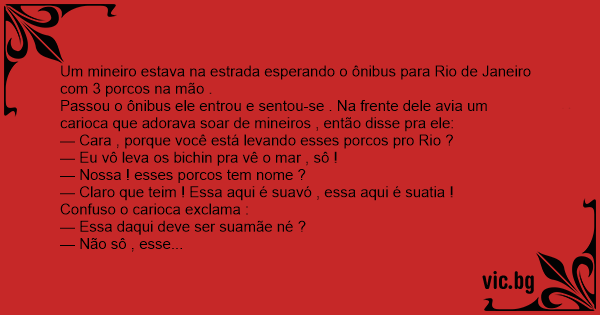 Passou o ônibus ele entrou e sentou-se . Na frente dele avia um carioca que adorava soar de mineiros , então disse pra ele: