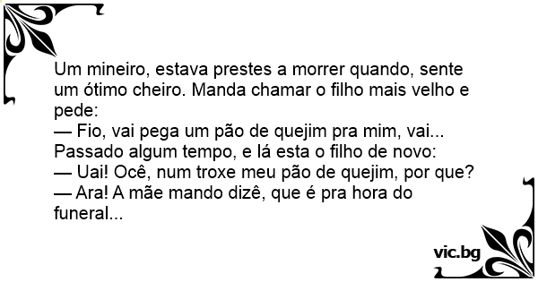 Um mineiro, estava prestes a morrer quando, sente um ótimo cheiro. Manda chamar o filho mais velho e pede: