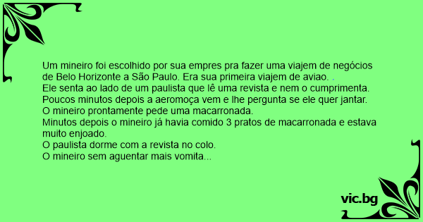 Um mineiro foi escolhido por sua empres pra fazer uma viajem de negócios de Belo Horizonte a São Paulo. Era sua primeira viajem de aviao.