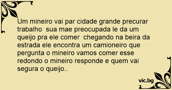 Um mineiro vai par cidade grande precurar trabalho sua mae preocupada le da um queijo pra ele comer chegando na beira da estrada ele encontra um camioneiro que pergunta o mineiro vamos comer esse redondo o mineiro responde e quem vai segura o queijo..