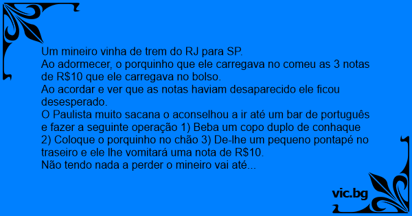 Não tendo nada a perder o mineiro vai até um bar do português e pede uma dose dupla de conhaque que tomada de uma única vez, coloca o porquinho no chão e lhe aplica uma chute no traseiro que imediatamente cospe uma nota de 10.