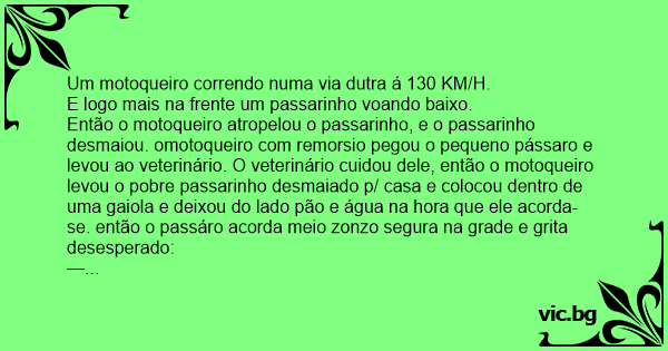 Então o motoqueiro atropelou o passarinho, e o passarinho desmaiou. omotoqueiro com remorsio pegou o pequeno pássaro e levou ao veterinário. O veterinário cuidou dele, então o motoqueiro levou o pobre passarinho desmaiado p/ casa e colocou dentro de uma gaiola e deixou do lado pão e água na hоrа que ele acorda- se. então o passáro acorda meio zonzo segura na grade e grita desesperado: