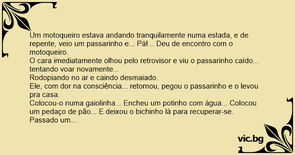 Um motoqueiro estava andando tranquilamente numa estada, e de repente, veio um passarinho e... Pá!... Deu de encontro com o motoqueiro.