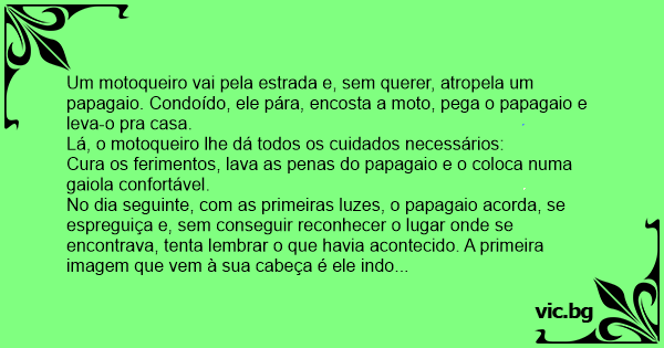 Um motoqueiro vai pela estrada e, sem querer, atropela um papagaio. Condoído, ele pára, encosta a moto, pega o papagaio e leva-o pra casa.