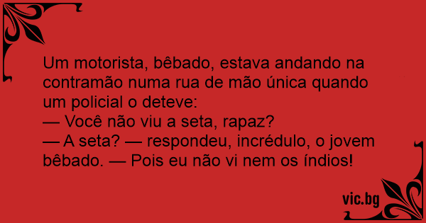— A seta? — respondeu, incrédulo, o jovem bêbado. — Pois eu não vi nem os índios!