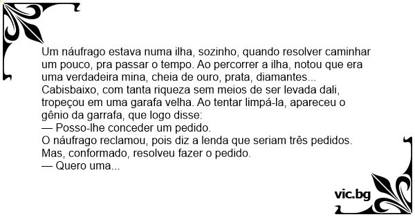 O náufrago reclamou, pois diz a lenda que seriam três pedidos. Mas, conformado, resolveu fazer o pedido.