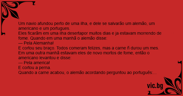 Eles ficarãm em uma ilha desertapor muitos dias e ja estavam morrendo de fome. Quando em uma manhã o alemão disse: