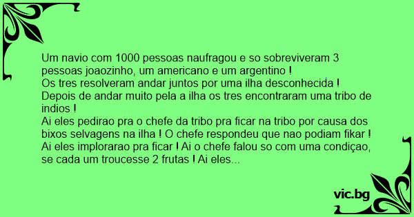 Um navio com 1000 pessoas naufragou e so sobreviveram 3 pessoas joaozinho, um americano e um argentino !