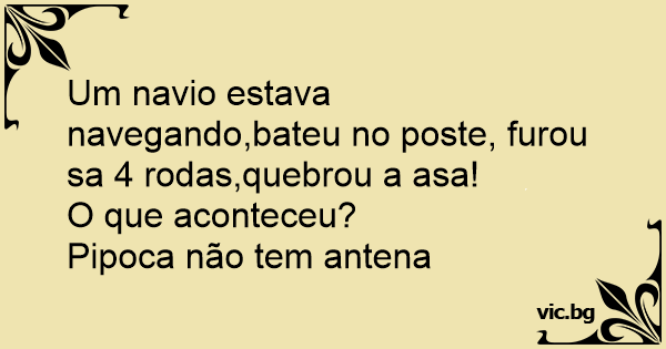 Um navio estava navegando,bateu no poste, furou sa 4 rodas,quebrou a asa!