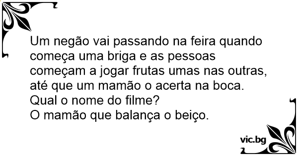 Um negão vai passando na feira quando começa uma briga e as pessoas começam a jogar frutas umas nas outras, até que um mamão o acerta na boca.