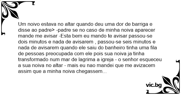 Um noivo estava no altar quando deu uma dor de barriga e disse ao padre> -padre se no caso de minha noiva aparecer mande me avisar -Esta bem eu mando te avisar passou-se dois minutos e nada de avisarem , passou-se seis minutos e nada de avisarem quando ele saiu do banheiro tinha uma fila de pessoas preocupada com ele pois sua noiva ja tinha transformado num mar de lagrima a igreja - o senhor esqueceu a sua noiva no altar - mais eu nao mandei que me avizacem assim que a minha noiva chegassem -sim mas a culpa e do senhor que não escutou o nosso chamado -mais como eu iria ouvir se voces nem abrirão a boca