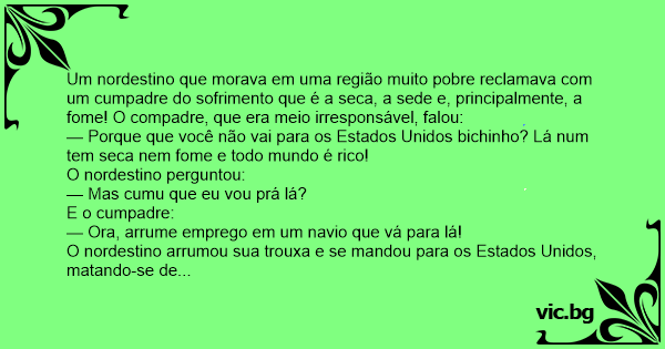 Um nordestino que morava em uma região muito pobre reclamava com um cumpadre do sofrimento que é a seca, a sede e, principalmente, a fome! O compadre, que era meio irresponsável, falou: