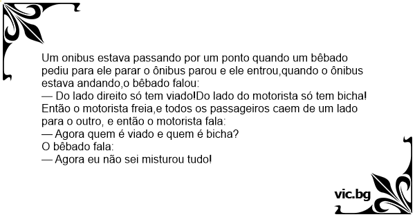 Um onibus estava passando por um ponto quando um bêbado pediu para ele parar o ônibus parou e ele entrou,quando o ônibus estava andando,o bêbado falou: