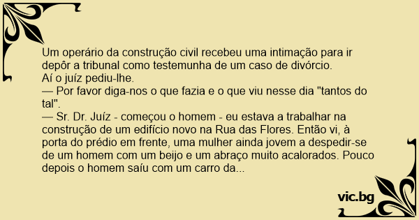 — Sr. Dr. Juíz - começou o homem - eu estava a trabalhar na construção de um edifício novo na Rua das Flores. Então vi, à porta do prédio em frente, uma mulher ainda jovem a despedir-se de um homem com um beijo e um abraço muito acalorados. Pouco depois o homem saíu com um carro da garagem do prédio.