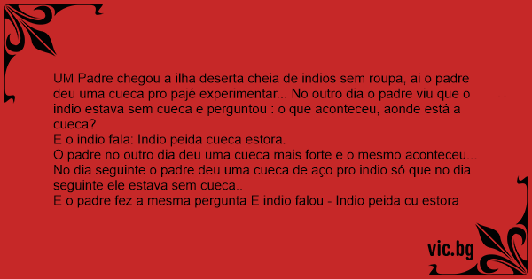 UM Padre chegou a ilha deserta cheia de indios sem roupa, ai o padre deu uma cueca pro pajé experimentar... No outro dia o padre viu que o indio estava sem cueca e perguntou : o que aconteceu, aonde está a cueca?