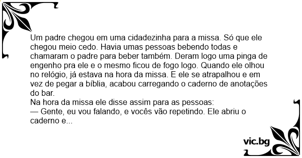 Um padre chegou em uma cidadezinha para a missa. Só que ele chegou meio cedo. Havia umas pessoas bebendo todas e chamaram o padre para beber também. Deram logo uma pinga de engenho pra ele e o mesmo ficou de fogo logo. Quando ele olhou no relógio, já estava na hоrа da missa. E ele se atrapalhou e em vez de pegar a bíblia, acabou carregando o caderno de anotações do bar.