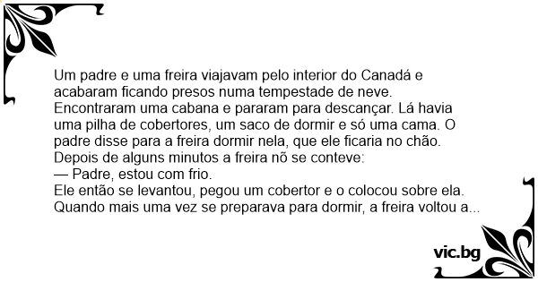 Um padre e uma freira viajavam pelo interior do Canadá e acabaram ficando presos numa tempestade de neve.