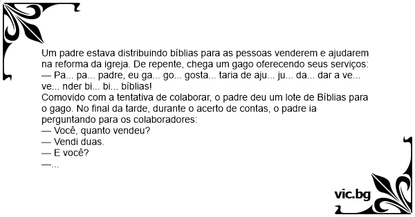 Comovido com a tentativa de colaborar, o padre deu um lote de Bíblias para o gago. No final da tarde, durante o acerto de contas, o padre ia perguntando para os colaboradores:
