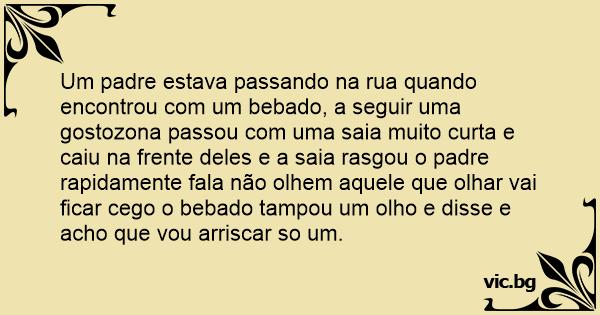 Um padre estava passando na rua quando encontrou com um bebado, a seguir uma gostozona passou com uma saia muito curta e caiu na frente deles e a saia rasgou o padre rapidamente fala não olhem aquele que olhar vai ficar cego o bebado tampou um olho e disse e acho que vou arriscar so um.
