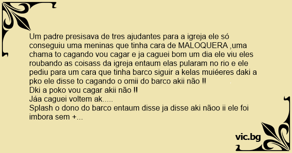 Um padre presisava de tres ajudantes para a igreja ele só conseguiu uma meninas que tinha cara de MALOQUERA ,uma chama to cagando vou саgаr e ja caguei bom um dia ele viu eles roubando as coisass da igreja entaum elas pularam no rio e ele pediu para um cara que tinha barco siguir a kelas muiéeres daki a pko ele disse to cagando o omii do barco akii não !!