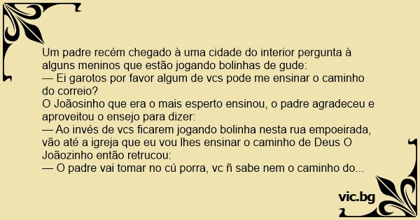— Ao invés de vcs ficarem jogando bolinha nesta rua empoeirada, vão até a igreja que eu vou lhes ensinar o caminho de Deus O Joãozinho então retrucou: