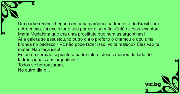 Um padre recém chegado em uma paróquia na fronteira do Brasil com a Argentina, foi executar o seu primeiro sermão -Então Jesus levantou Maria Madalena que era uma prostituta que nem as argentinas!
