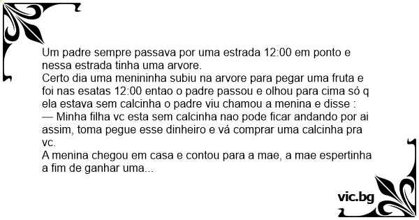 Certo dia uma menininha subiu na arvore para pegar uma fruta e foi nas esatas 12:00 entao o padre passou e olhou para cima só q ela estava sem calcinha o padre viu chamou a menina e disse :