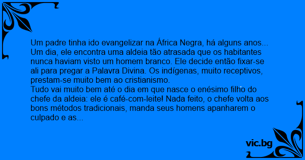 Numa aldeia africana, nasceu uma criança branca. Imediatamente o Cacique mandou chamar o missionário, que era o único homem branco por ali. - Cacique quer explicação! - pediu ele, enfezado. O...