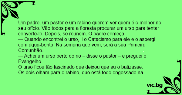 Um padre, um pastor e um rabino querem ver quem é o melhor no seu ofício. Vão todos para a floresta procurar um urso para tentar convertê-lo. Depois, se reúnem. O padre começa: