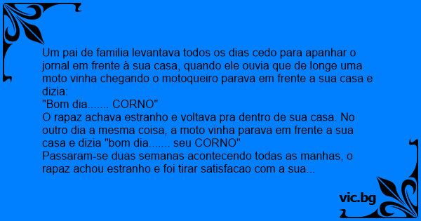 Um pai de familia levantava todos os dias cedo para apanhar o jornal em frente à sua casa, quando ele ouvia que de longe uma moto vinha chegando o motoqueiro parava em frente a sua casa e dizia: