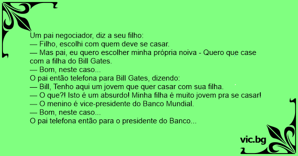 — Mas pai, eu quero escolher minha própria noiva - Quero que case com a filha do Bill Gates.