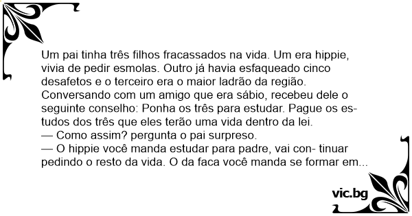 Um pai tinha três filhos fracassados na vida. Um era hippie, vivia de pedir esmolas. Outro já havia esfaqueado cinco desafetos e o terceiro era o maior ladrão da região. Conversando com um amigo que era sábio, recebeu dele o seguinte conselho: Ponha os três para estudar. Pague os es- tudos dos três que eles terão uma vida dentro da lei.