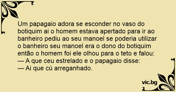 Um papagaio adora se esconder no vaso do botiquim ai o homem estava apertado para ir ao banheiro pediu ao seu manoel se poderia utilizar o banheiro seu manoel era o dono do botiquim então o homem foi ele olhou para o teto e falou: