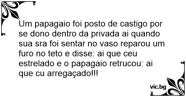 Um papagaio foi posto de castigo por se dono dentro da privada ai quando sua sra foi sentar no vaso reparou um furo no teto e disse: ai que ceu estrelado e o papagaio retrucou: ai que cu arregaçado!!!