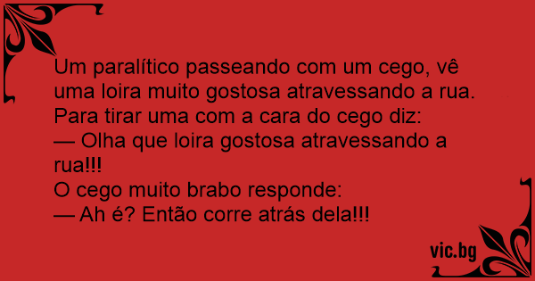 Um paralítico passeando com um cego, vê uma loira muito gostosa atravessando a rua. Para tirar uma com a cara do cego diz:
