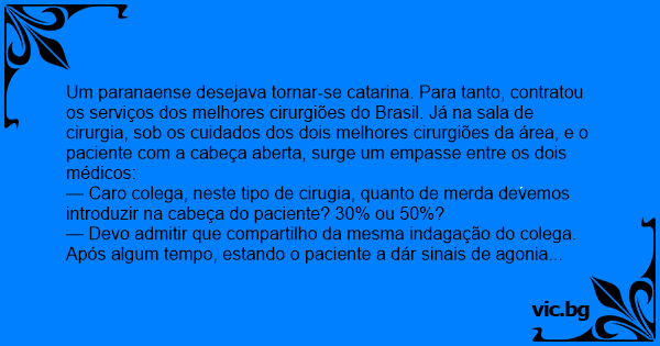 Um paranaense desejava tornar-se catarina. Para tanto, contratou os serviços dos melhores cirurgiões do Brasil. Já na sala de cirurgia, sob os cuidados dos dois melhores cirurgiões da área, e o paciente com a cabeça aberta, surge um empasse entre os dois médicos: