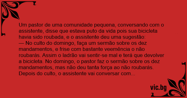 Десет божји заповеди Das gestohlene Fahrrad Ο ποδηλάτης παππάς Ου Μοιχεύσεις... 10 Εντολές священник зашел в гости к раввину и жалуется: - велосипед украли.... Отишъл попа при кмета и му се оплакал: Το καπέλο και ο παπάς... David spricht mit einem Rabbi: Um padre de uma pequena cidade fica desapontado ao descobrir que alguém roubou sua bicicleta. É uma cidade pequena e como ele não possui um carro, utilizava a bicicleta para chegar em todos os lugares. O mais preocupante é o fato de ele conhecer todos na cidade, já que todos são membros da sua... Deux curés de campagne avaient l'habitude de se croiser tous les dimanches matins alors qu'ils se rendaient, à vélo, dans leurs églises respectives. Cependant, à l'aube d'un beau dimanche matin du... Ein Mann geht sonntags zur Kirche und lauscht der Predigt über die Zehn Gebote. Daraufhin beschließt er, endlich mal wieder zu beichten. "Herr Pfarrer, ich habe gesündigt", beginnt er. "Dann rede,... Den unge prästen hade blivit av med sin cykel. På väg till kyrkan mötte han en äldre kollega och bad om råd hur han skulle göra. - Jag råkade ut för en liknande sak en gång, sa den äldre prästen,... Um padre estava andando na rua quando viu seu amigo Manoel com uma cara de enterro e falou: -Manoel o que esta acontecendo? -A compadre João roubaram minha bicicleta e eu acho que foi alguém da... Un cura está hablando de los diez mandamientos en su sermón, y cuando nombra "no debes robar ...", el señor Pérez se sujeta la cabeza, desesperado; pero cuando el cura menciona el "no debes cometer... Skradziono księdzu rower. Zatroskany zwraca się do kolegi z pobliskiej parafii o pomoc. - W niedzielę na mszy zrób kazanie o 10 przykazaniach a gdy dojdziesz do 7 zwracaj uwagę kto z wiernych się... A községi plébános elmegy a körzeti megbízotthoz. - Édes fiam, segíts, mert ellopták a biciklimet. Mit csináljak? - Mit, atyám? Vasárnap a prédikációjában tessék elsorolni a tízparancsolatot, és... Doi preoti se intalnesc pe strada, amandoi mergand pe jos: - Buna ziua parinte. - Sa traiesti parinte, unde e bicicleta dumitale, ca nici eu nu o mai gasasc pe a mea? - Nu pot sa-mi dau seama unde... Preotul satului merge la politia din localitate si se plinge: - Fiul meu drag, ajuta-ma, mi-au furat bicicleta. Ce sa ma fac? - Ce sa va faceti parinte? Duminica la slujba trebuie sa spuneti cele... A pap panaszkodik a helyi rendőrnek: - Biztos úr! Ellopták a biciklimet, mit tegyek? - Hát tiszteletes úr, nem sokat tudok magának segíteni. De, tudja mit? Ha holnap misét tart, sorolja fel a... Een man is zijn fiets kwijt. Hij gaat naar de pastoor en vertelt hem dat zijn karretje naar alle waarschijnlijkheid is gestolen. Daarom vraagt hij de pastoor of hij in zijn preek van aanstaande... Der Pfarrer predigt in seiner Sonntagsandacht wider den Ehebruch. Nach dem Gottesdienst bedankt sich ein männliches Gemeindemitglied überschwenglich bei dem geistlichen Herren. "Sind Sie durch...