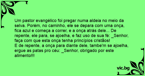Um pastor evangélico foi pregar numa aldeia no meio da selva. Porém, no caminho, ele se depara com uma onça, fiса azul e começa a correr, e a onça atrás dele... De repente, ele para, se ajoelha, e faz uso de sua fé: _Senhor, faça com que esta onça tenha princípios cristãos!