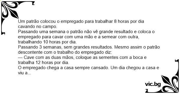Passando uma semana o patrão não vê grande resultado e coloca o empregado para cavar com uma mão e a semear com outra, trabalhando 10 horas por dia.
