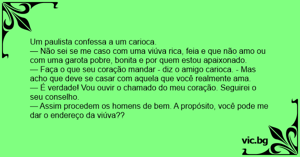 — Não sei se me caso com uma viúva rica, feia e que não amo ou com uma garota pobre, bonita e por quem estou apaixonado.