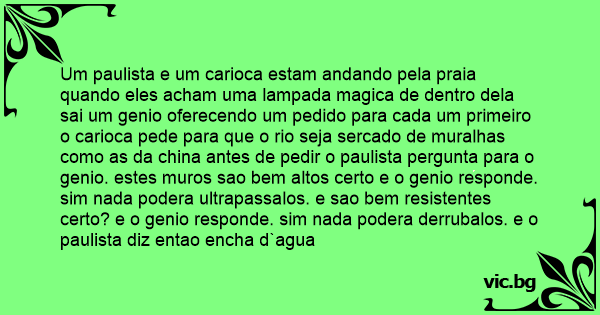 Um paulista e um carioca estam andando pela praia quando eles acham uma lampada magica de dentro dela sai um genio oferecendo um pedido para cada um primeiro o carioca pede para que o rio seja sercado de muralhas como as da china antes de pedir o paulista pergunta para o genio. estes muros sao bem altos certo e o genio responde. sim nada podera ultrapassalos. e sao bem resistentes certo? e o genio responde. sim nada podera derrubalos. e o paulista diz entao encha d`agua