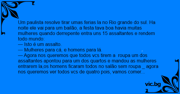 O cidadão paulista não conseguia entender pelo fato de ter muitas mulheres e os ladrão querendo comer os homens , então ele comentou com uns gauchos que estavam ao seu lado _ pô, tem um monte de mulher ai e eles querem nos comer mesmo assim.