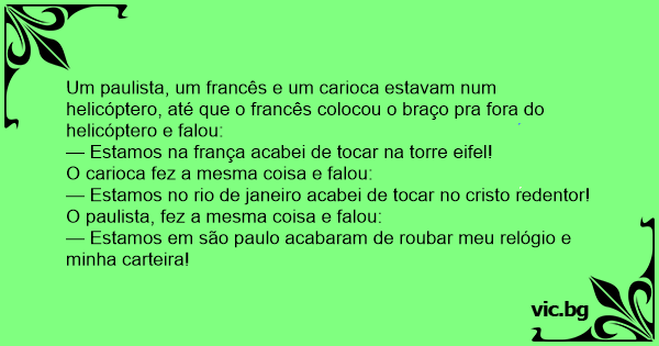 Um paulista, um francês e um carioca estavam num helicóptero, até que o francês colocou o braço pra fora do helicóptero e falou: