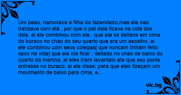 Um peao, namorava a filha do fazendeiro,mas ele nao tranzava com ela , por que o pai dela ficava na cola dos dois, ai ele combinou com ela , que ela se deitace em cima do buraco no chao do seu quarto que era um asoalho, ai ele combinou com seus colegas[ que nuncam tinham feito sеxо na vida] que ele iria ficar , deitado no chao de baixo do quarto da menina, ai eles iriam levantalo ate que seu реnis entrasse no buraco, ai ele disse: para que eles fizeçem um movimento de baixo para cima, e quando ele comesace a gemer , eles comesacem a empurrar mais rapido ainda,para ele poder gozar.