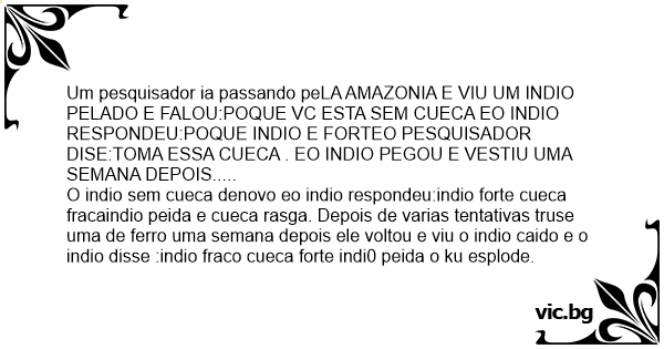 Um pesquisador ia passando peLA AMAZONIA E VIU UM INDIO PELADO E FALOU:POQUE VC ESTA SEM CUECA EO INDIO RESPONDEU:POQUE INDIO E FORTEO PESQUISADOR DISE:TOMA ESSA CUECA . EO INDIO PEGOU E VESTIU UMA SEMANA DEPOIS.....
