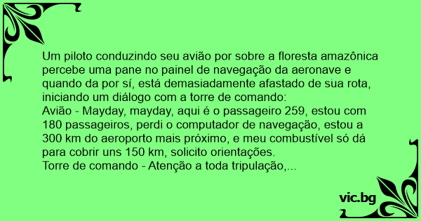Avião - Mayday, mayday, aqui é o passageiro 259, estou com 180 passageiros, perdi o computador de navegação, estou a 300 km do aeroporto mais próximo, e meu combustível só dá para cobrir uns 150 km, solicito orientações.