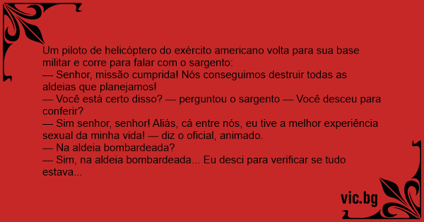 — Sim senhor, senhor! Aliás, cá entre nós, eu tive a melhor experiência sеxuаl da minha vida! — diz o oficial, animado.