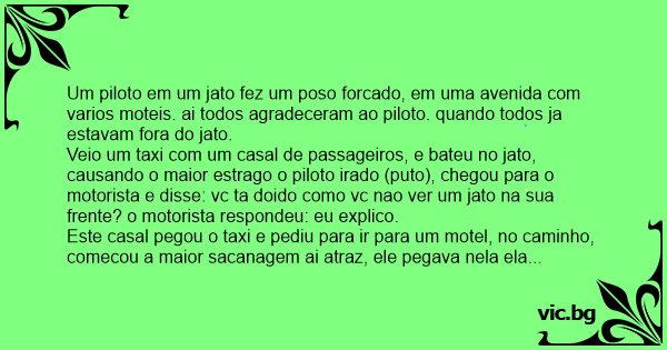 Veio um taxi com um casal de passageiros, e bateu no jato, causando o maior estrago o piloto irado (рuто), chegou para o motorista e disse: vc ta doido como vc nao ver um jato na sua frente? o motorista respondeu: eu explico.